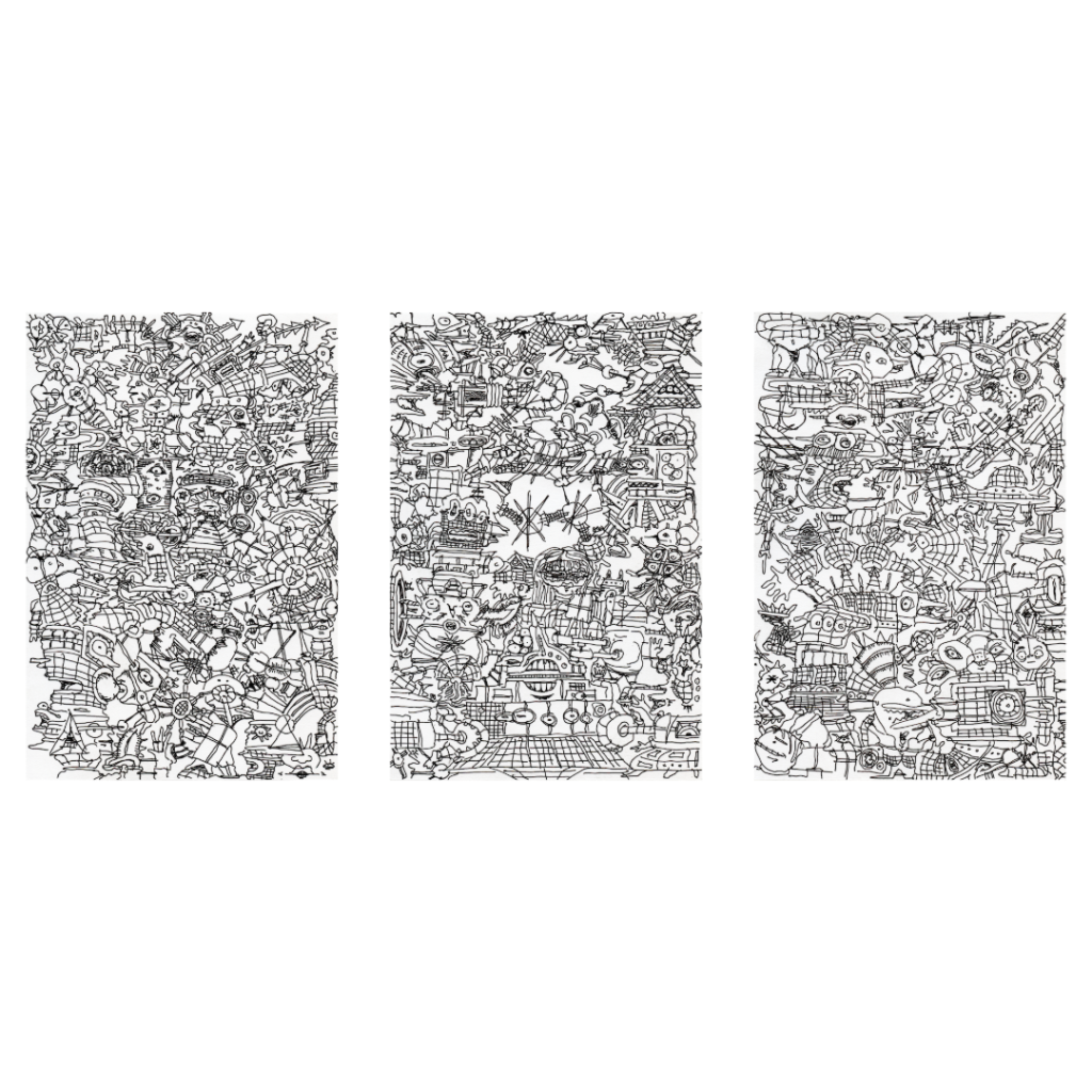 He likes to simply draw, have fun, and live. Sound and music are his main source of inspiration, helping him drown out thoughts to focus on rhythm and flow. While he’s open to experimentation, nothing compares to filling sketchbooks with silly drawings.